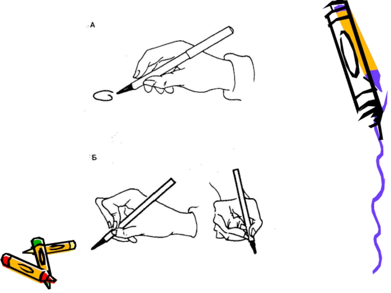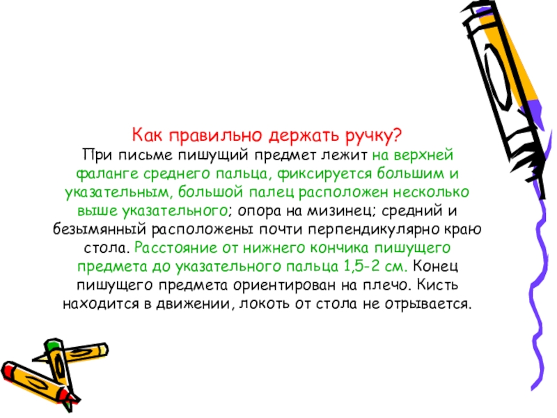 среднего пальца, фиксируется большим и указательным, большой палец расположен несколько выше указательного; опора на мизинец; средний и безымянный расположены почти перпендикулярно краю стола. Расстояние от нижнего кончика пишущего предмета до указательного пальца 1,5-2 см. Конец пишущего предмета ориентирован на плечо. Кисть находится в движении, локоть от стола не отрывается.