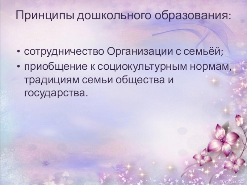 Принципы дошкольного образования: сотрудничество Организации с семьёй;приобщение к социокультурным нормам, традициям семьи общества и государства.