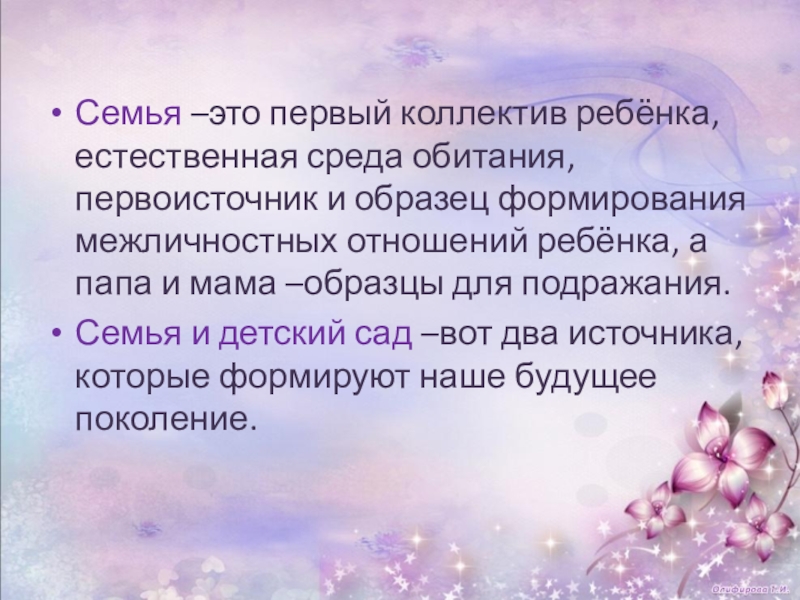 Семья и детский сад –вот два источника, которые формируют наше будущее поколение.