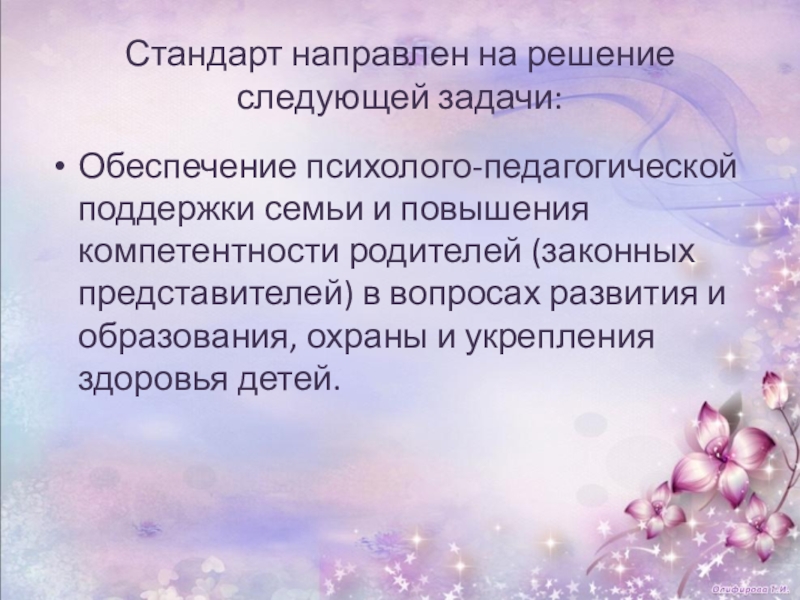 Стандарт направлен на решение следующей задачи:Обеспечение психолого-педагогической поддержки семьи и повышения компетентности родителей (законных представителей) в вопросах