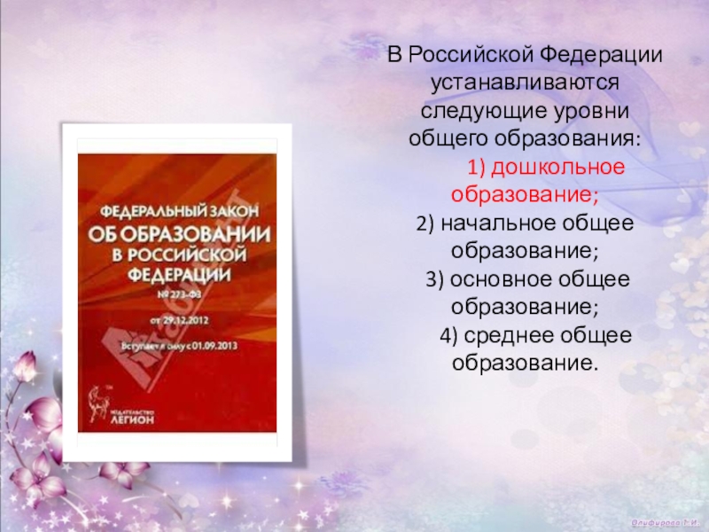 В Российской Федерации устанавливаются следующие уровни общего образования: 1) дошкольное образование; 2) начальное общее образование; 3) основное общее образование; 4) среднее общее образование.