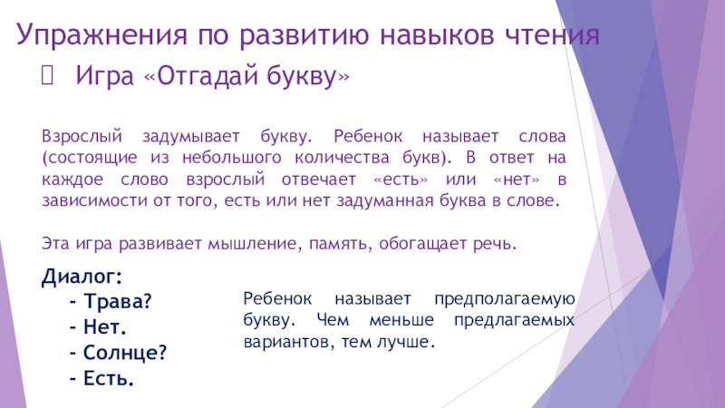 Ребенок называет предполагаемую букву. Чем меньше предлагаемых вариантов, тем лучше.