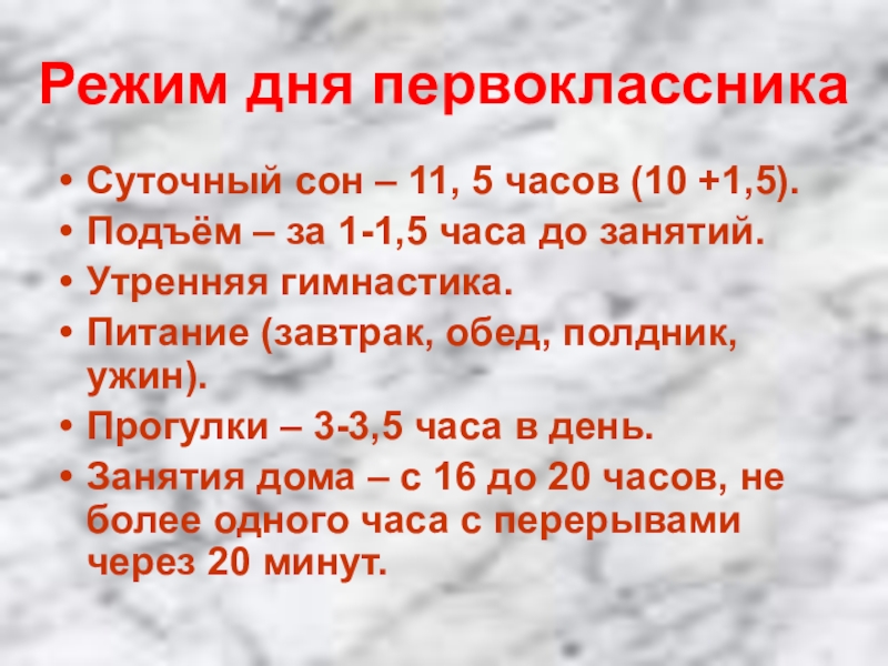 Занятия дома – с 16 до 20 часов, не более одного часа с перерывами через 20 минут.