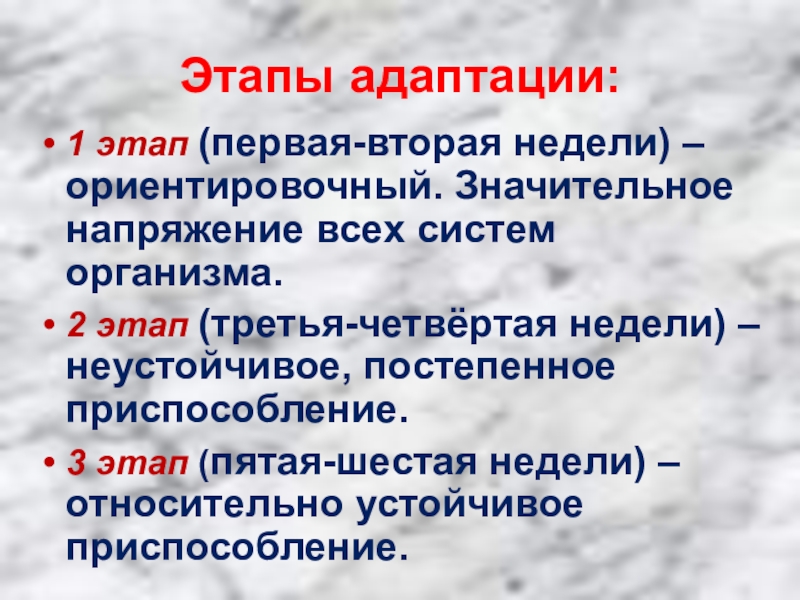 3 этап (пятая-шестая недели) – относительно устойчивое приспособление.