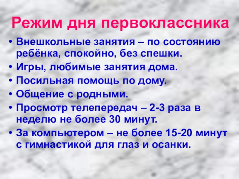 Внешкольные занятия – по состоянию ребёнка, спокойно, без спешки.