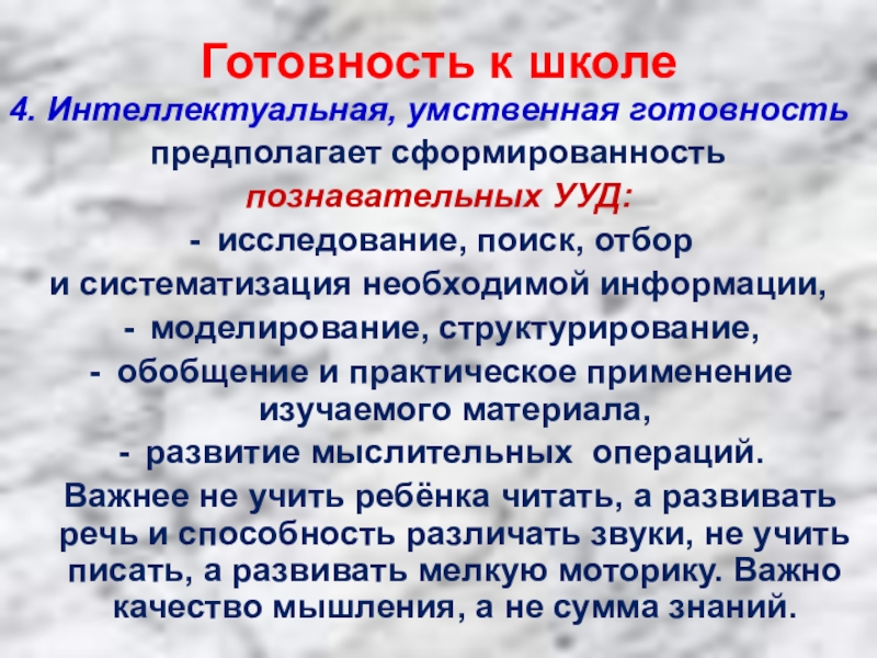 Важнее не учить ребёнка читать, а развивать речь и способность различать звуки, не учить писать, а развивать мелкую моторику. Важно качество мышления, а не сумма знаний.