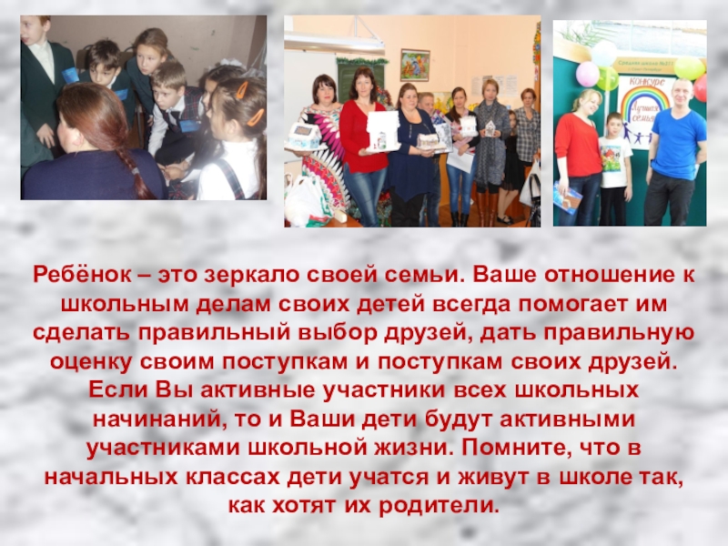 своих детей всегда помогает им сделать правильный выбор друзей, дать правильную оценку своим поступкам и поступкам своих друзей. Если Вы активные участники всех школьных начинаний, то и Ваши дети будут активными участниками школьной жизни. Помните, что в начальных классах дети учатся и живут в школе так, как хотят их родители.