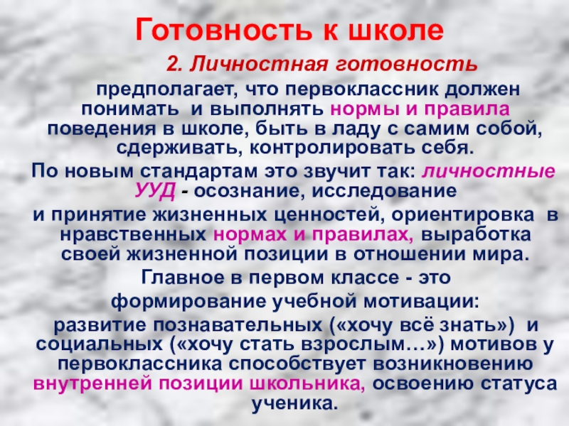 предполагает, что первоклассник должен понимать и выполнять нормы и правила поведения в школе, быть в ладу с самим собой, сдерживать, контролировать себя.
