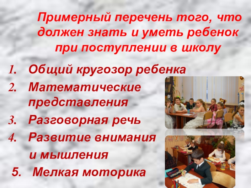 Слайд 4Примерный перечень того, что должен знать и уметь ребенок при поступлении