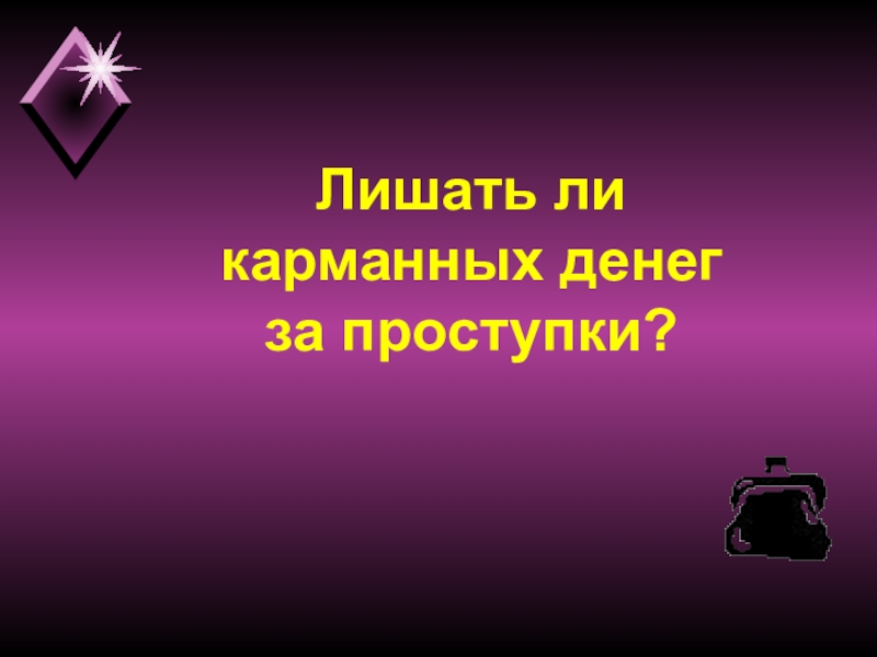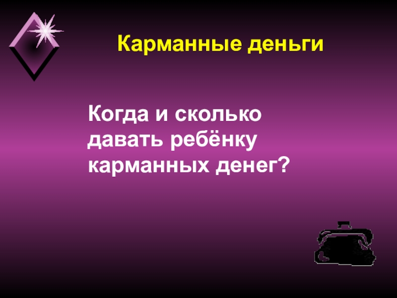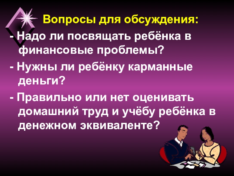 Вопросы для обсуждения: - Надо ли посвящать ребёнка в финансовые проблемы?- Нужны ли ребёнку карманные деньги?- Правильно