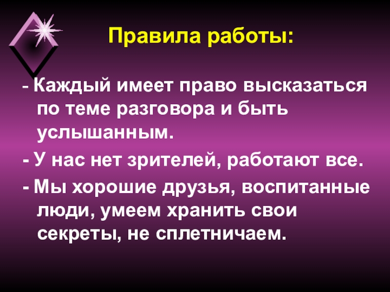 Правила работы:- Каждый имеет право высказаться по теме разговора и быть услышанным.- У нас нет зрителей, работают все. - Мы хорошие друзья, воспитанные люди, умеем хранить свои секреты, не сплетничаем.