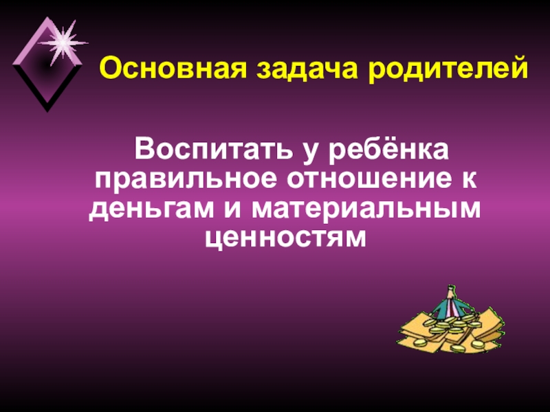Основная задача родителей   Воспитать у ребёнка правильное отношение к деньгам и материальным ценностям