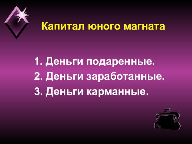 Капитал юного магната  1. Деньги подаренные.  2. Деньги заработанные.  3. Деньги карманные.