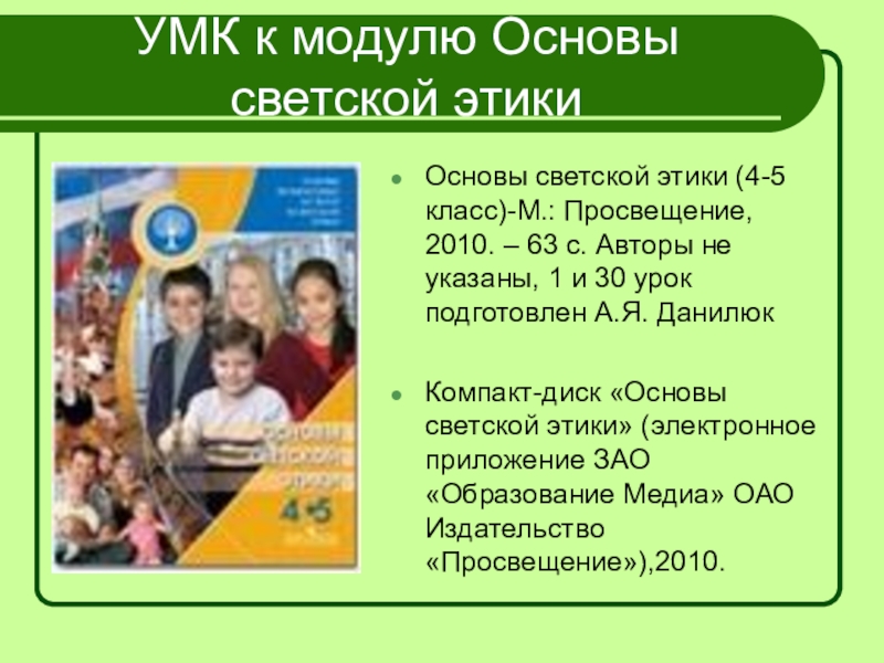 Компакт-диск «Основы светской этики» (электронное приложение ЗАО «Образование Медиа» ОАО Издательство «Просвещение»),2010.