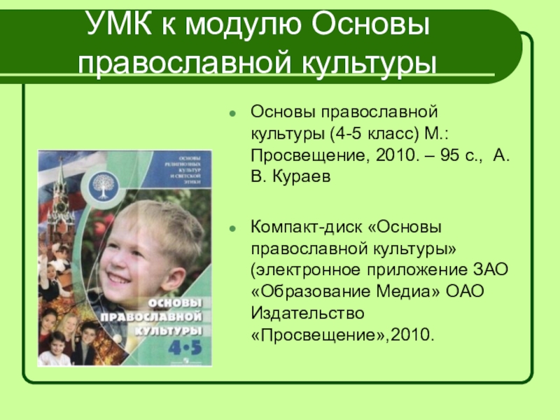 Компакт-диск «Основы православной культуры» (электронное приложение ЗАО «Образование Медиа» ОАО Издательство «Просвещение»,2010.