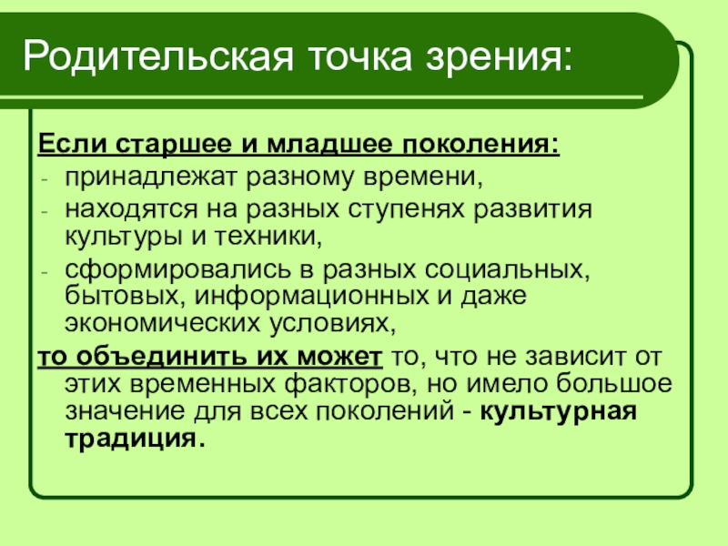 то объединить их может то, что не зависит от этих временных факторов, но имело большое значение для всех поколений - культурная традиция.