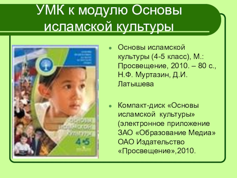 Компакт-диск «Основы исламской культуры» (электронное приложение ЗАО «Образование Медиа» ОАО Издательство «Просвещение»,2010.