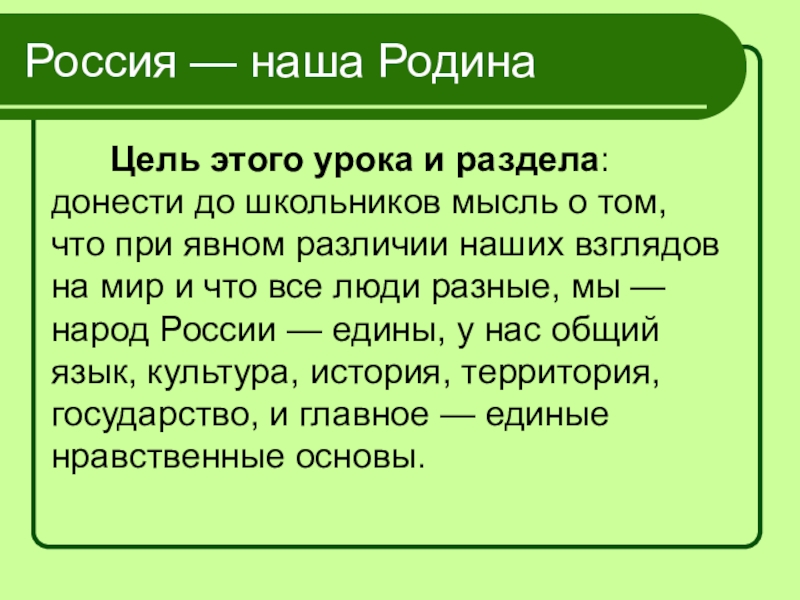 урока и раздела: донести до школьников мысль о том, что при явном различии наших взглядов на мир и что все люди разные, мы — народ России — едины, у нас общий язык, культура, история, территория, государство, и главное — единые нравственные основы.