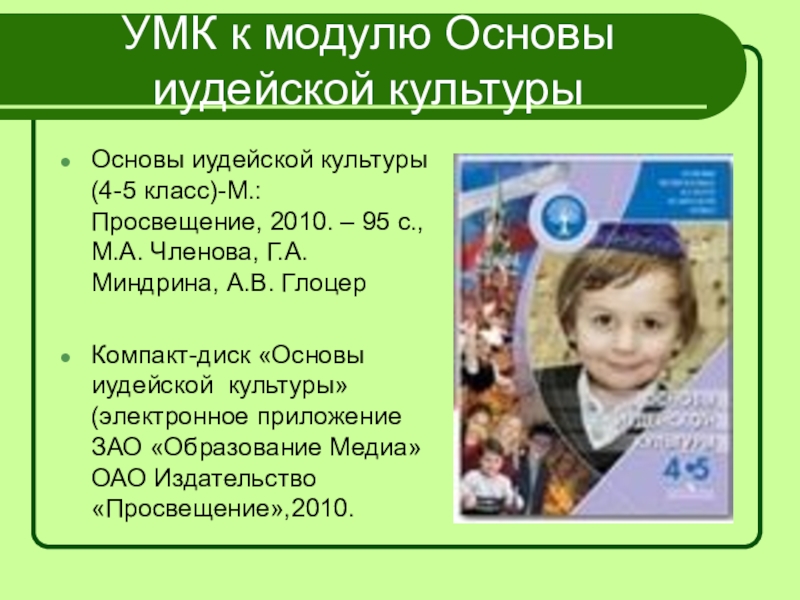 Компакт-диск «Основы иудейской культуры» (электронное приложение ЗАО «Образование Медиа» ОАО Издательство «Просвещение»,2010.