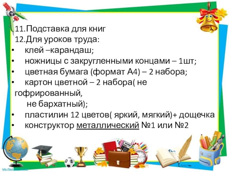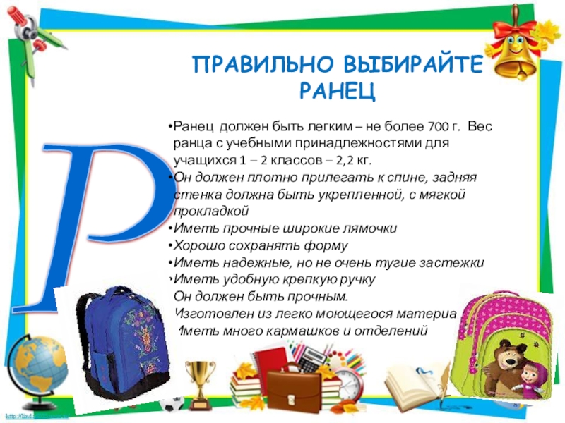 г. Вес ранца с учебными принадлежностями для учащихся 1 – 2 классов – 2,2 кг.