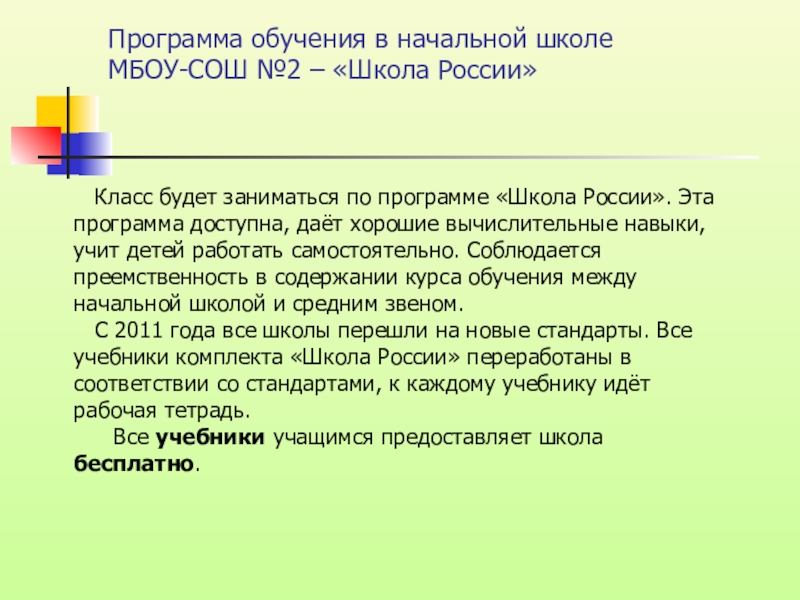 Класс будет заниматься по программе «Школа России». Эта программа доступна, даёт хорошие вычислительные навыки, учит детей работать самостоятельно. Соблюдается преемственность в содержании курса обучения между начальной школой и средним звеном.