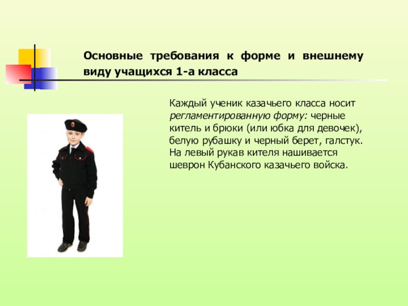 Слайд 41Основные требования к форме и внешнему виду учащихся 1-а класса