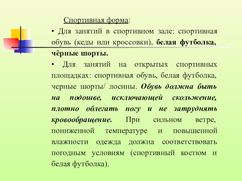 • Для занятий на открытых спортивных площадках: спортивная обувь, белая футболка, черные шорты/ лосины. Обувь должна быть на подошве, исключающей скольжение, плотно облегать ногу и не затруднять кровообращение. При сильном ветре, пониженной температуре и повышенной влажности одежда должна соответствовать погодным условиям (спортивный костюм и белая футболка).