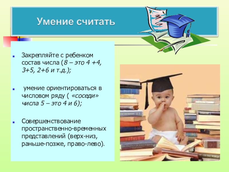 умение ориентироваться в числовом ряду ( «соседи» числа 5 – это 4 и 6);