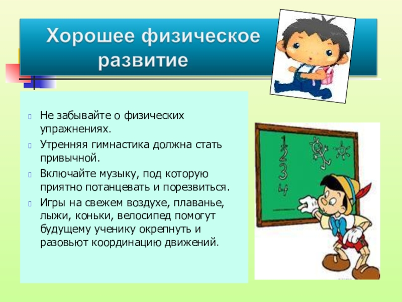 Игры на свежем воздухе, плаванье, лыжи, коньки, велосипед помогут будущему ученику окрепнуть и разовьют координацию движений.