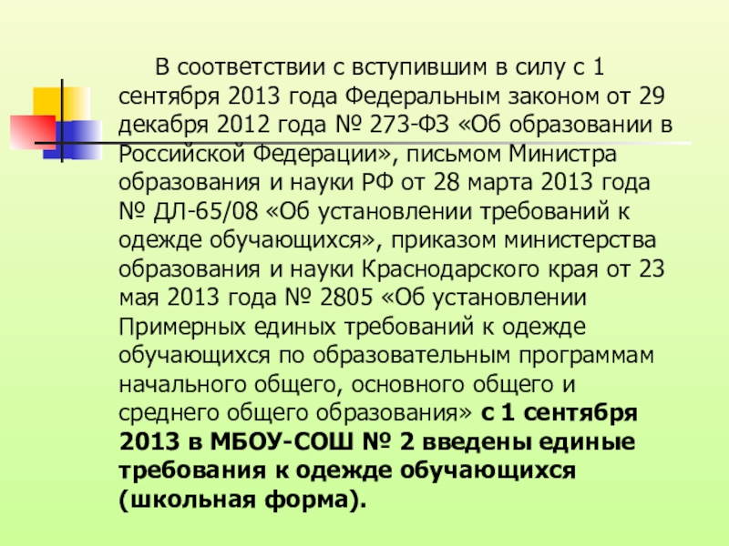 Федеральным законом от 29 декабря 2012 года № 273-ФЗ «Об образовании в Российской Федерации», письмом Министра образования и науки РФ от 28 марта 2013 года № ДЛ-65/08 «Об установлении требований к одежде обучающихся», приказом министерства образования и науки Краснодарского края от 23 мая 2013 года № 2805 «Об установлении Примерных единых требований к одежде обучающихся по образовательным программам начального общего, основного общего и среднего общего образования» с 1 сентября 2013 в МБОУ-СОШ № 2 введены единые требования к одежде обучающихся (школьная форма).