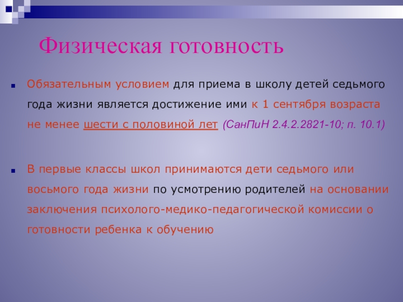 является достижение ими к 1 сентября возраста не менее шести с половиной лет (СанПиН 2.4.2.2821-10; п. 10.1)