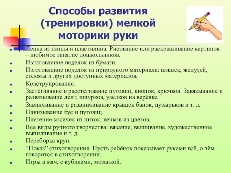 Слайд 12Способы развития (тренировки) мелкой моторики руки