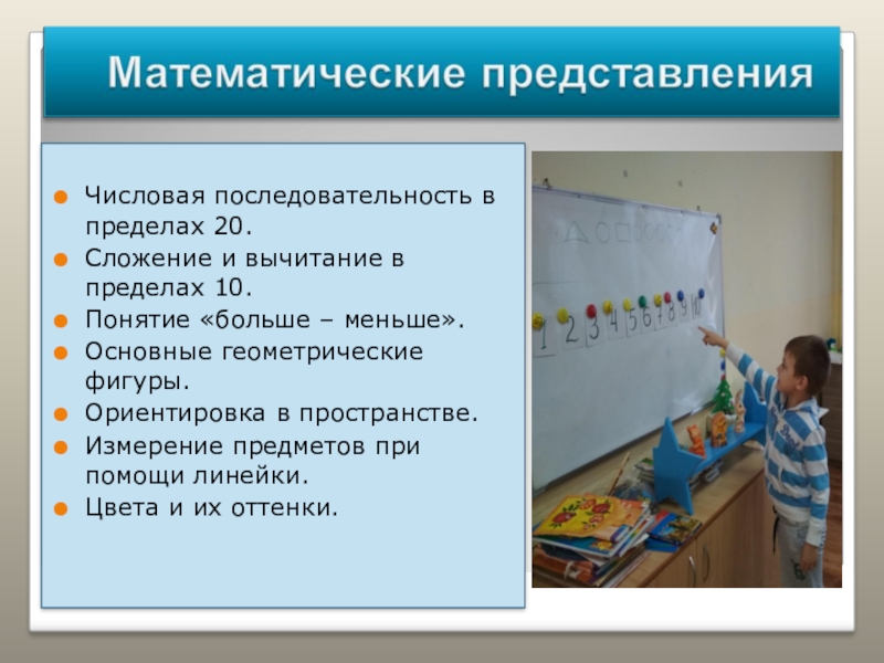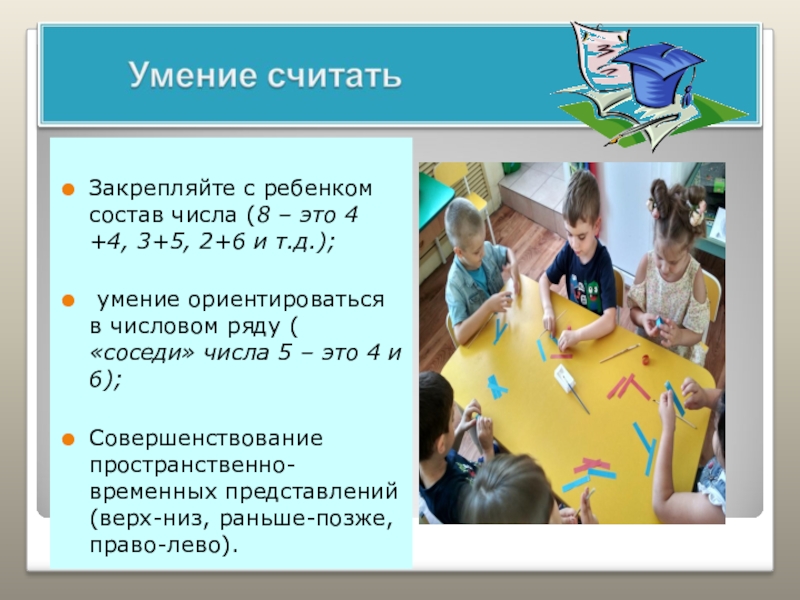умение ориентироваться в числовом ряду ( «соседи» числа 5 – это 4 и 6);
