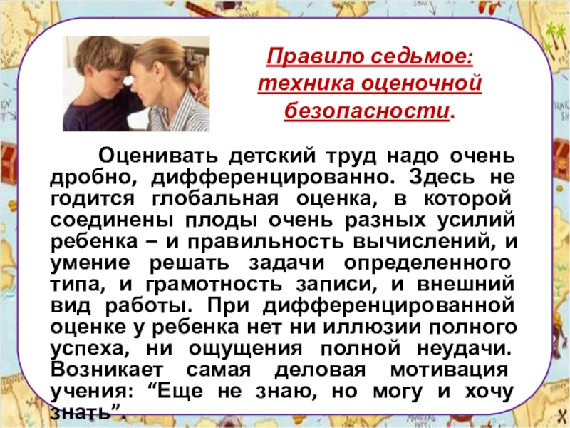 Слайд 13Правило пятое: оценка должна сравнивать сегодняшние успехи ребенка с его собственными