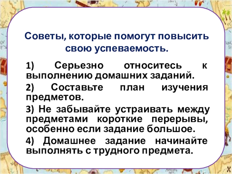 Слайд 6Советы, которые помогут повысить свою успеваемость.