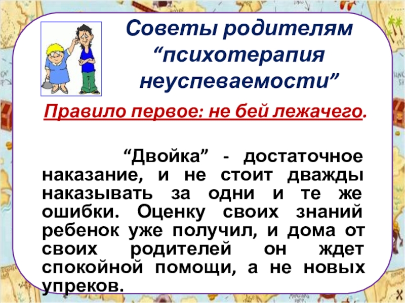 Слайд 9Советы родителям “психотерапия неуспеваемости”