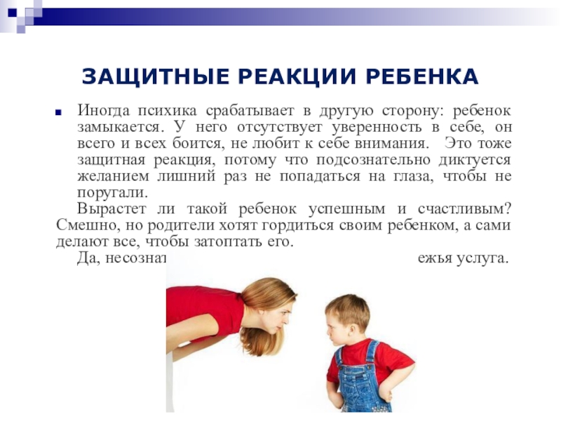 и отсутствия логики родителей. Он становится зависимым от мнения и поведения родителей. Он понимает, что то, что можно сегодня, может быть завтра запрещено… Но почему так происходит – он не понимает.