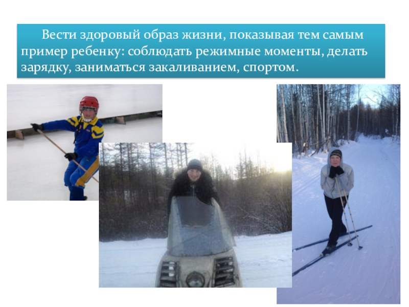 Слайд 5 Вести здоровый образ жизни, показывая тем самым пример ребенку: соблюдать режимные