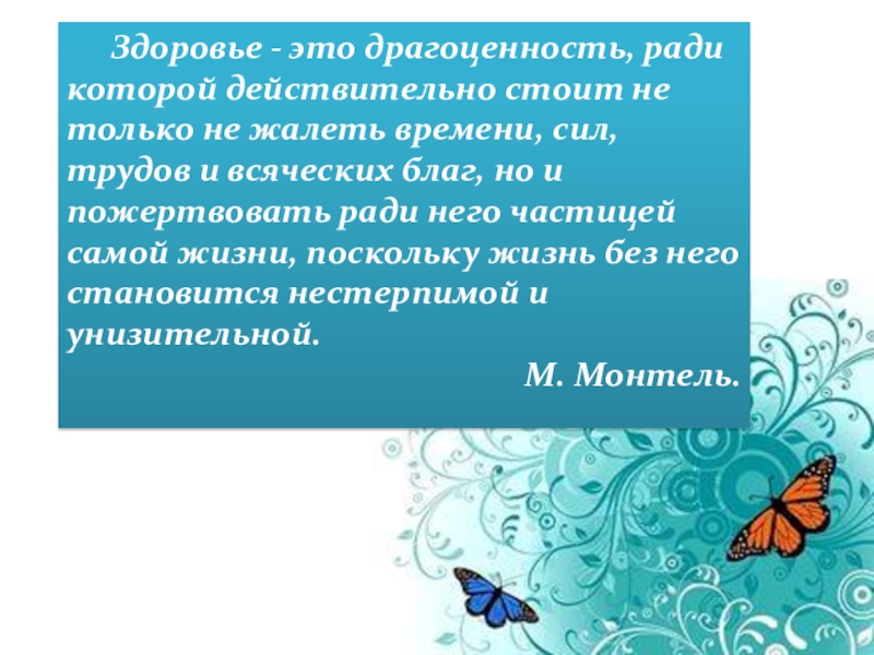 Здоровье - это драгоценность, ради которой действительно стоит не только не жалеть времени, сил, трудов и всяческих благ, но и пожертвовать ради него частицей самой жизни, поскольку жизнь без него становится нестерпимой и унизительной.М. Монтель.