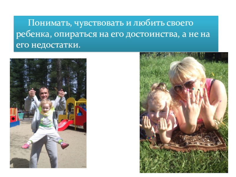 Слайд 4 Понимать, чувствовать и любить своего ребенка, опираться на его достоинства, а