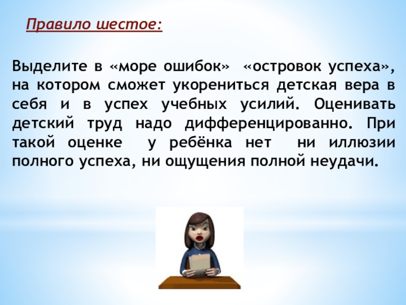 Слайд 10Выделите в «море ошибок» «островок успеха», на котором сможет укорениться детская