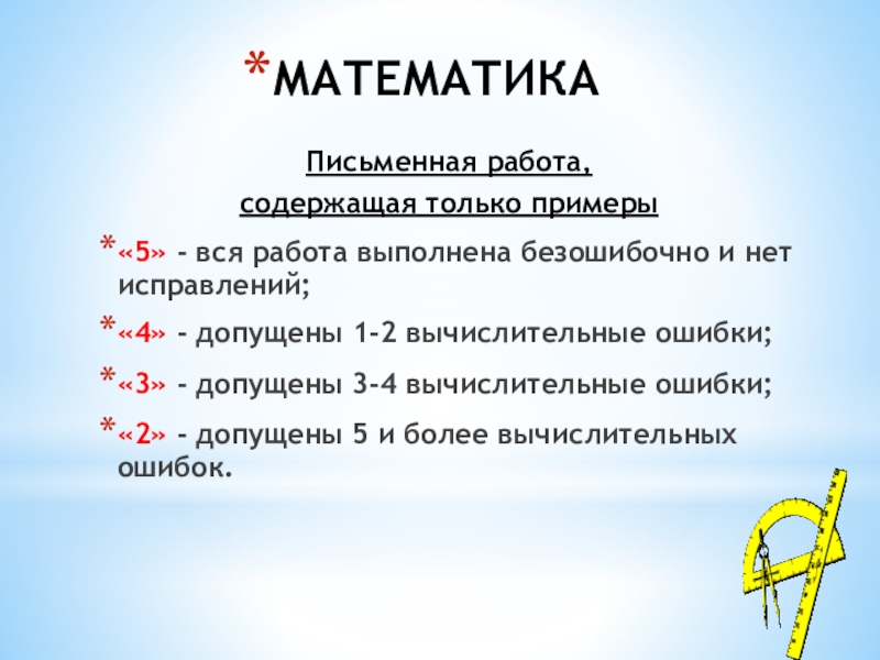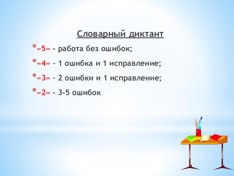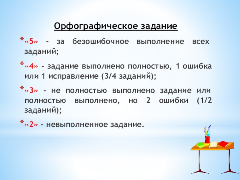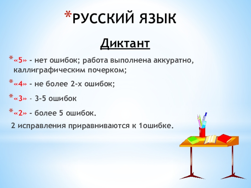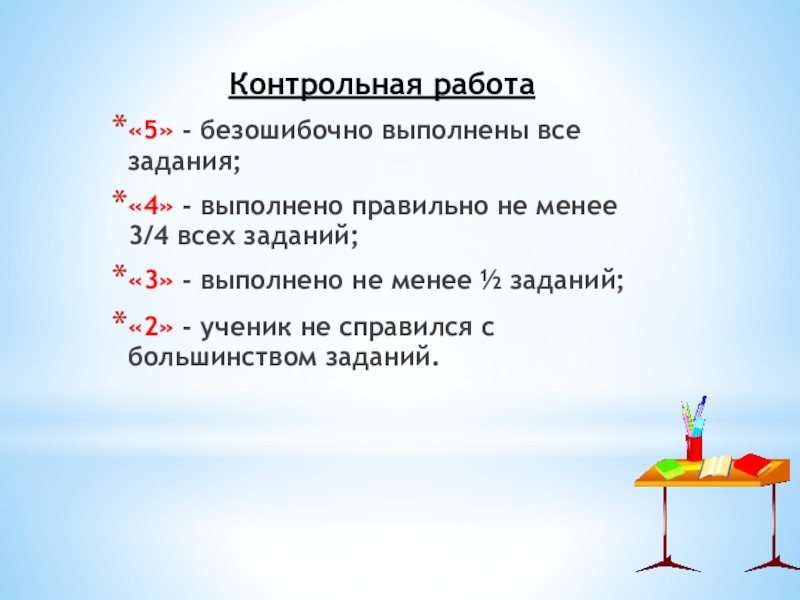 «5» - нет ошибок; работа выполнена аккуратно, каллиграфическим почерком;