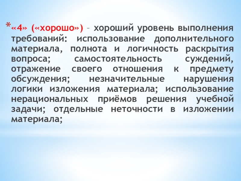 Слайд 16«4» («хорошо») – хороший уровень выполнения требований: использование дополнительного материала, полнота