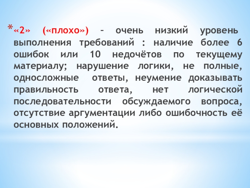 Слайд 18«2» («плохо») – очень низкий уровень выполнения требований : наличие более