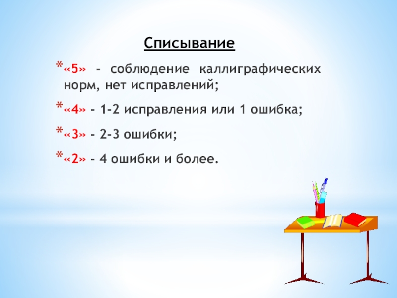 «5» - соблюдение каллиграфических норм, нет исправлений;