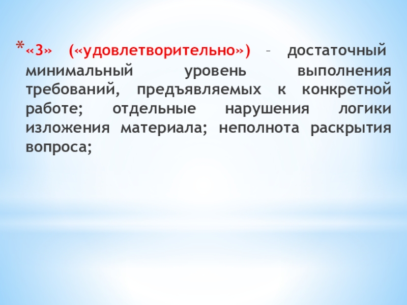 Слайд 17«3» («удовлетворительно») – достаточный минимальный уровень выполнения требований, предъявляемых к конкретной