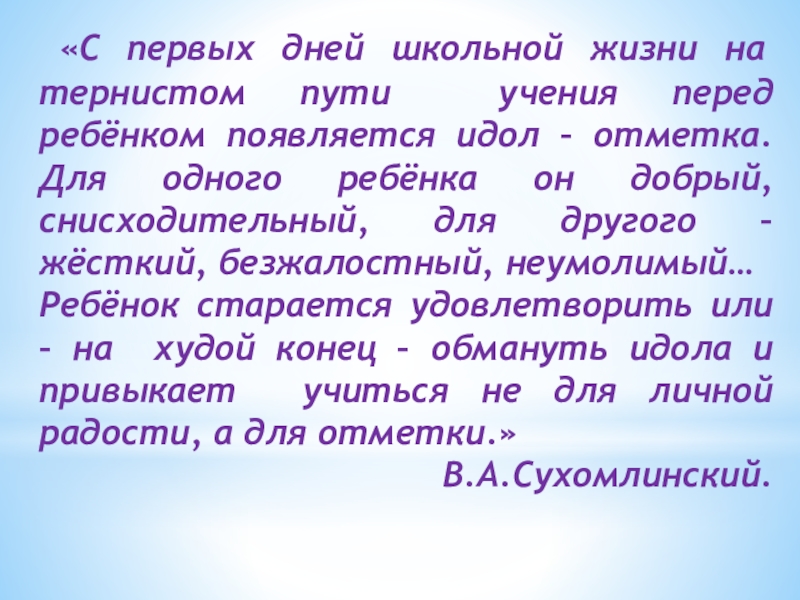 Ребёнок старается удовлетворить или – на худой конец – обмануть идола и привыкает учиться не для личной радости, а для отметки.»