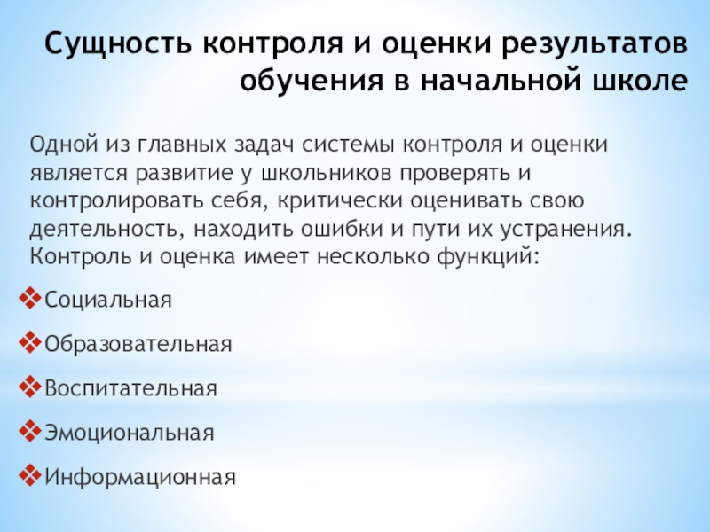 задач системы контроля и оценки является развитие у школьников проверять и контролировать себя, критически оценивать свою деятельность, находить ошибки и пути их устранения. Контроль и оценка имеет несколько функций: