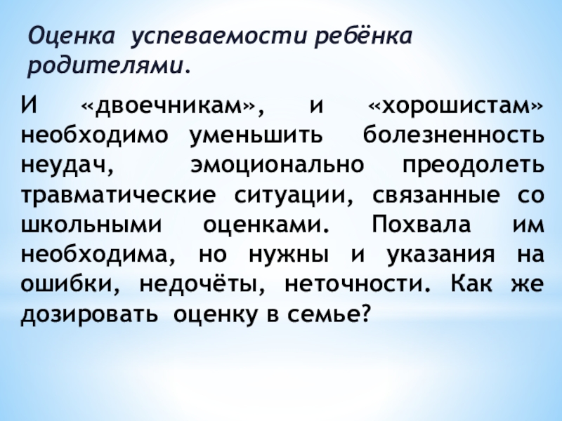 эмоционально преодолеть травматические ситуации, связанные со школьными оценками. Похвала им необходима, но нужны и указания на ошибки, недочёты, неточности. Как же дозировать оценку в семье?