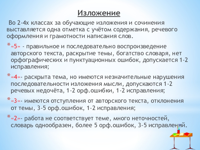 «5» - правильное и последовательно воспроизведение авторского текста, раскрытие темы, богатство словаря, нет орфографических и пунктуационных ошибок, допускается 1-2 исправления;
